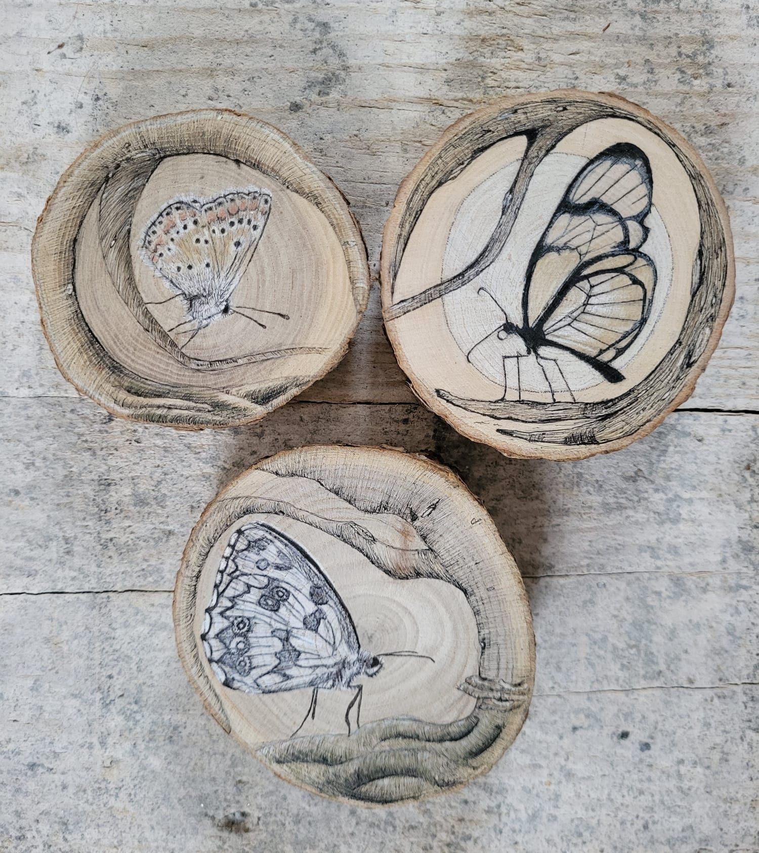 Three butterflies made with ink and a small addition of coloured pencil on wood.