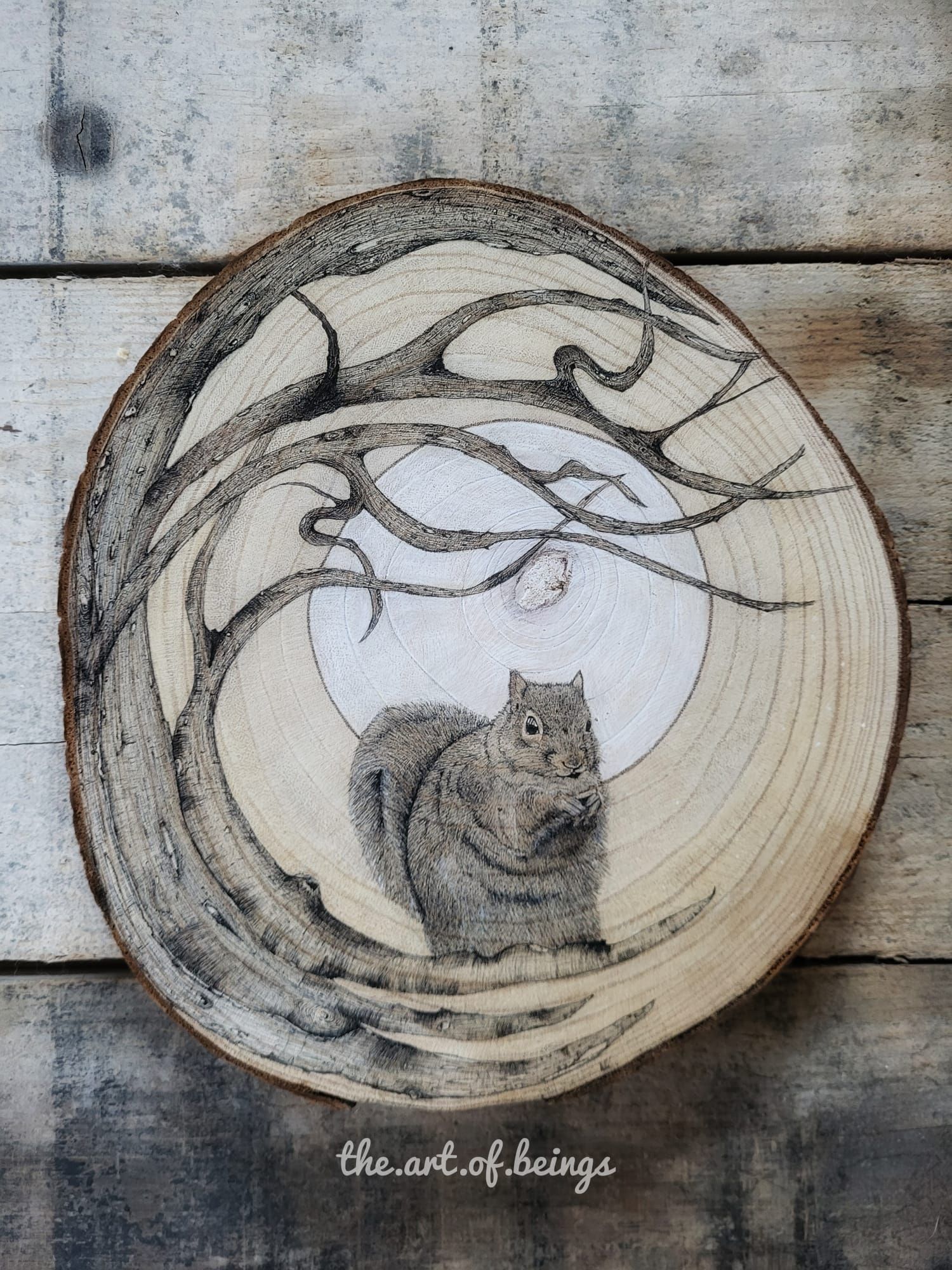Squirrel and trees made with ink and a small addition of coloured pencil on wood.