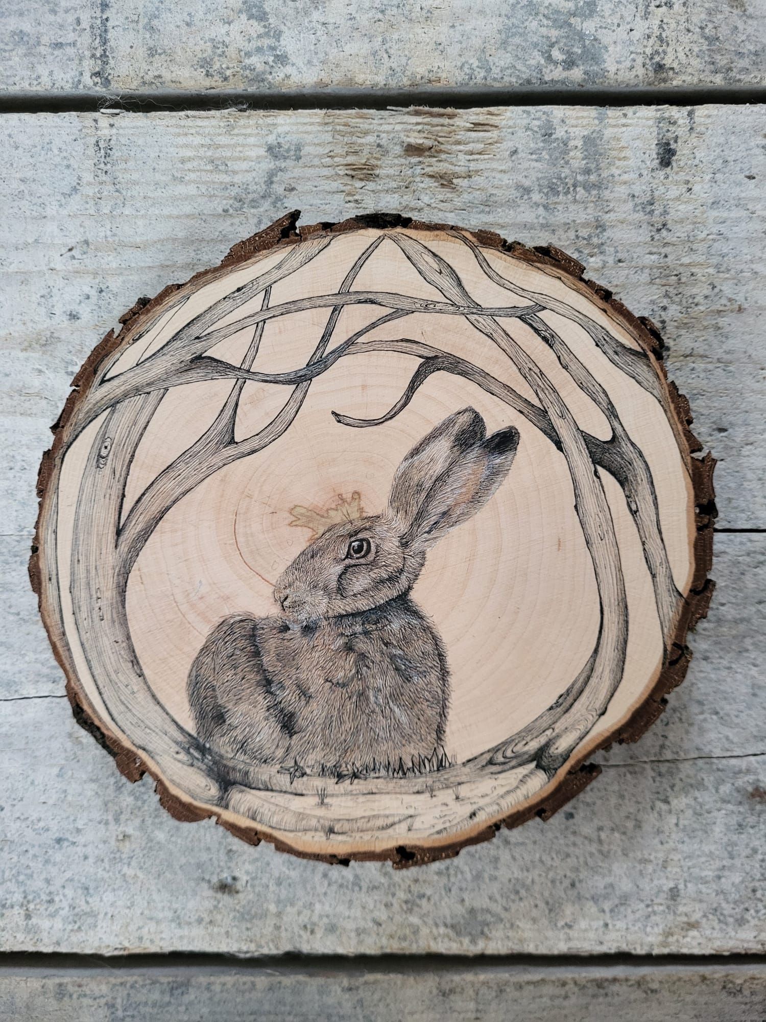 Hare and trees made with ink and a small addition of coloured pencil on wood. The hare wears a natural crown.