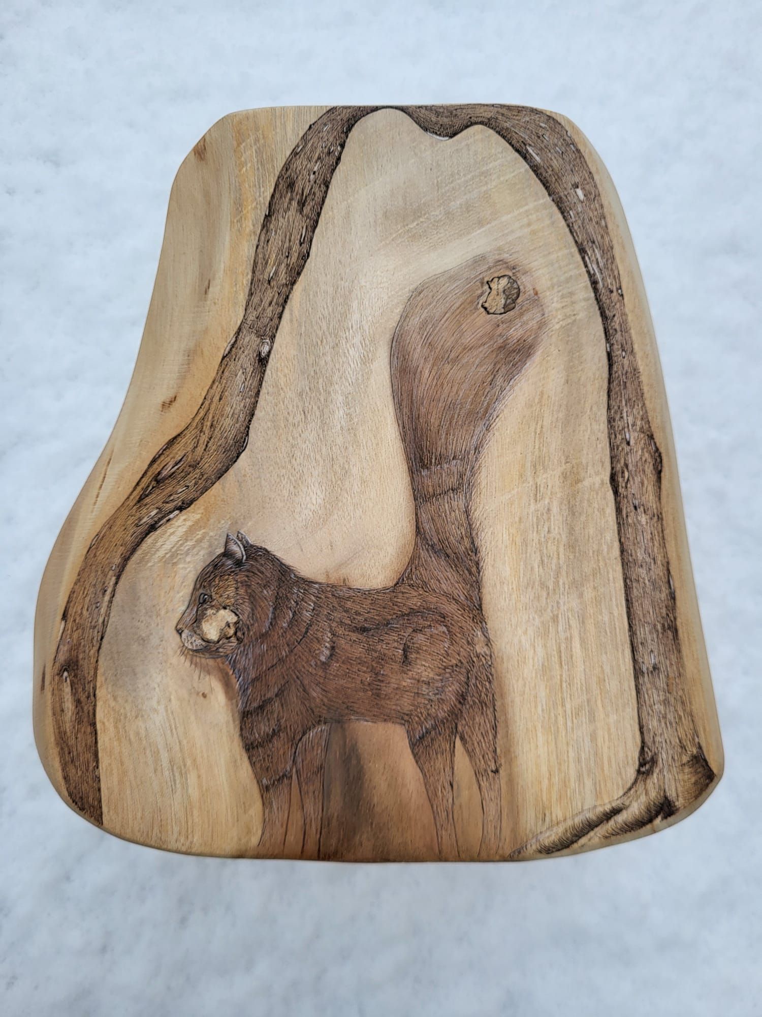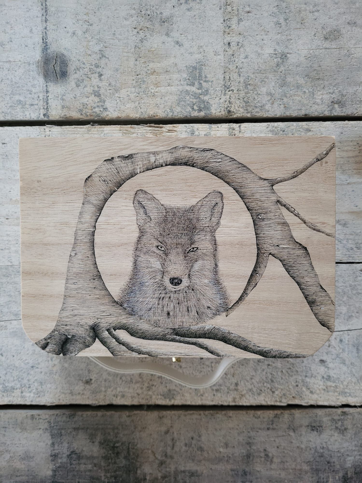Fox and tree with ink on wooden suitcase. You can use this beautiful box to storage your most beautiful photos or special letters. Or you can use it as a memorybox with special memories. Or maybe you will use it to collect the treasures you found in the forrest.