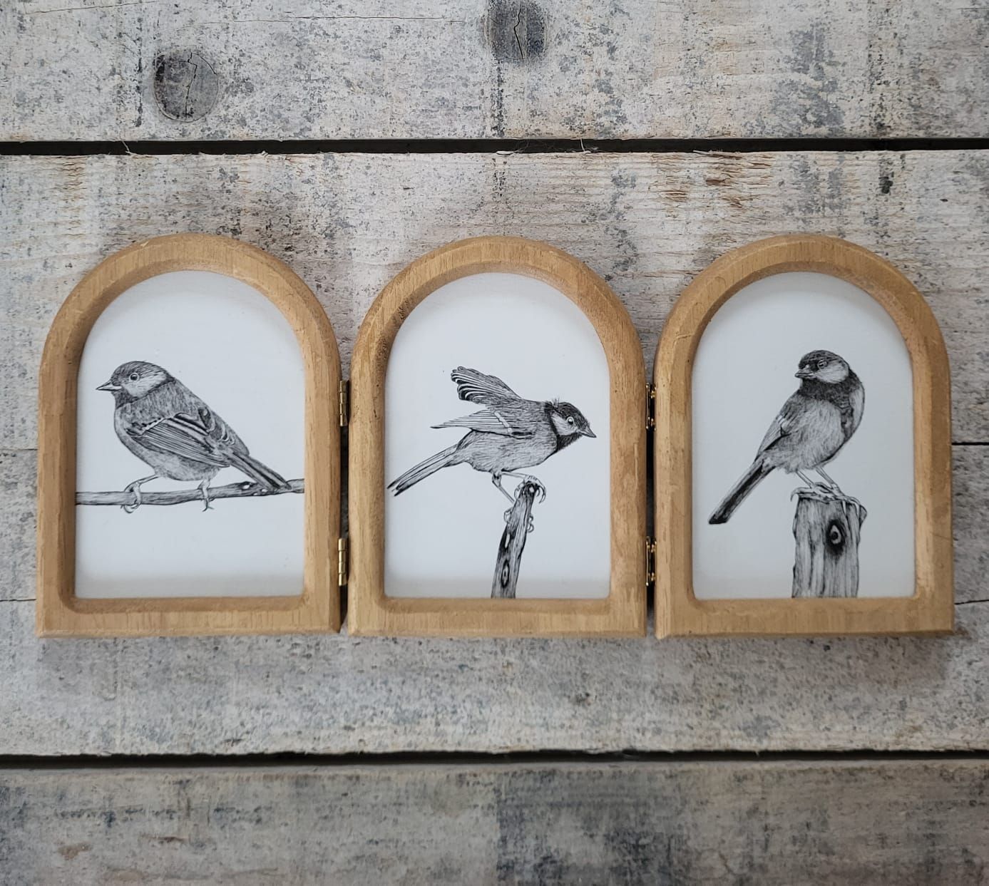 Three great tits made with ink on paper and framed in a wooden 3 panel.