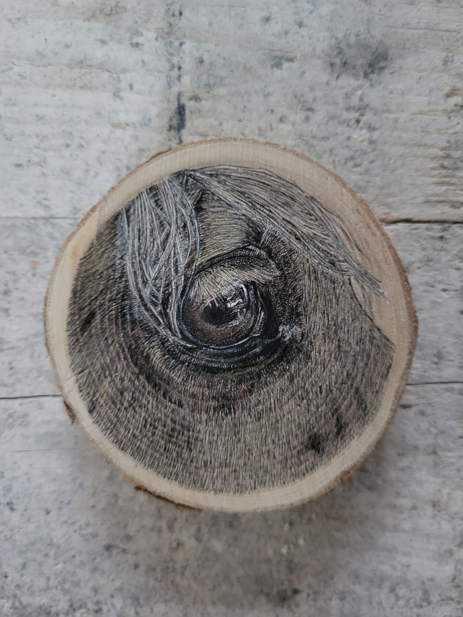 The eye of Rosa (a horse living at Sanctuary het Wijland) with ink and a little addition of colored pencil on wood.