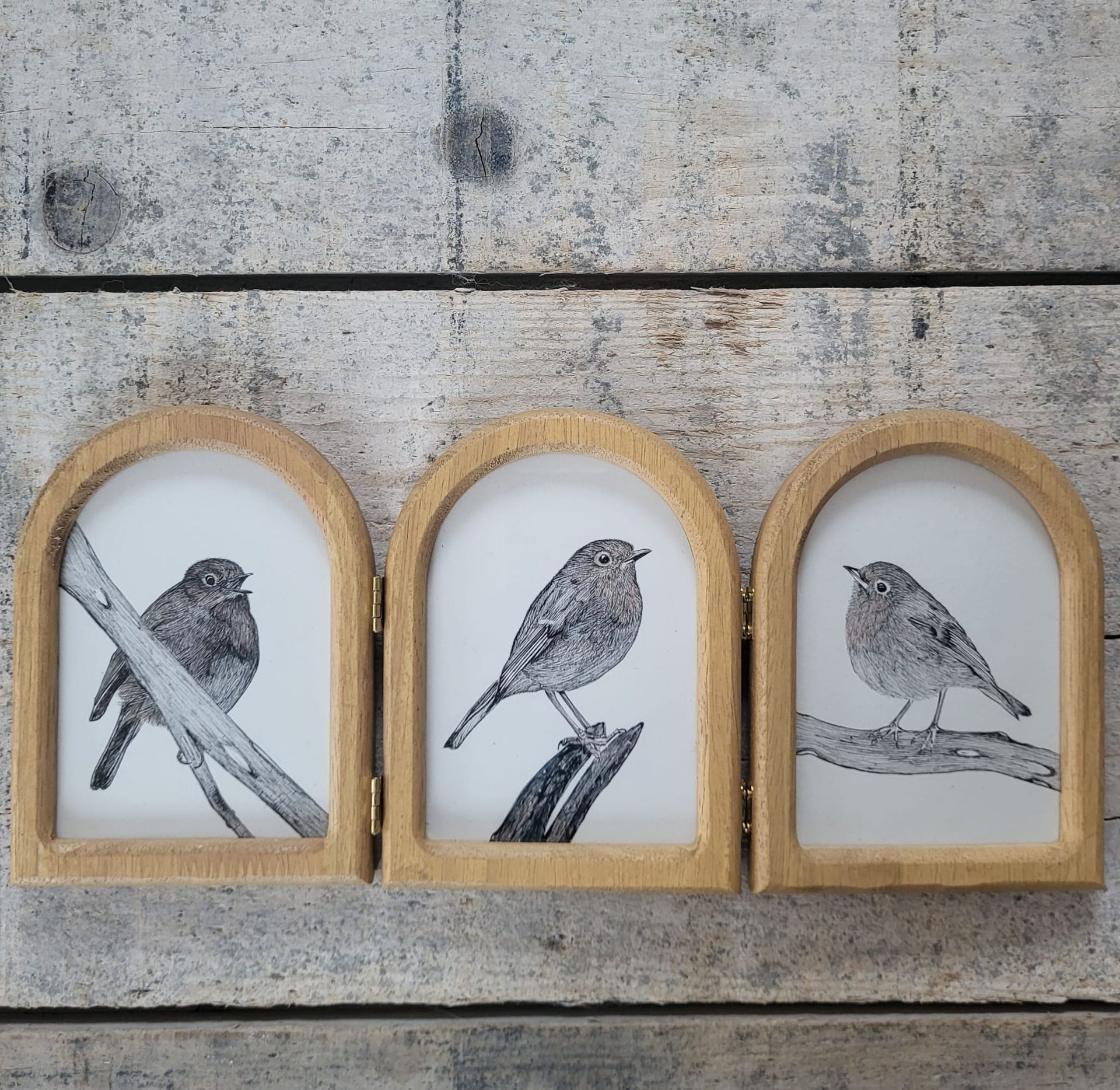 Three robins made with ink and a small addition of coloured pencil on paper and framed in a wooden 3 panel.