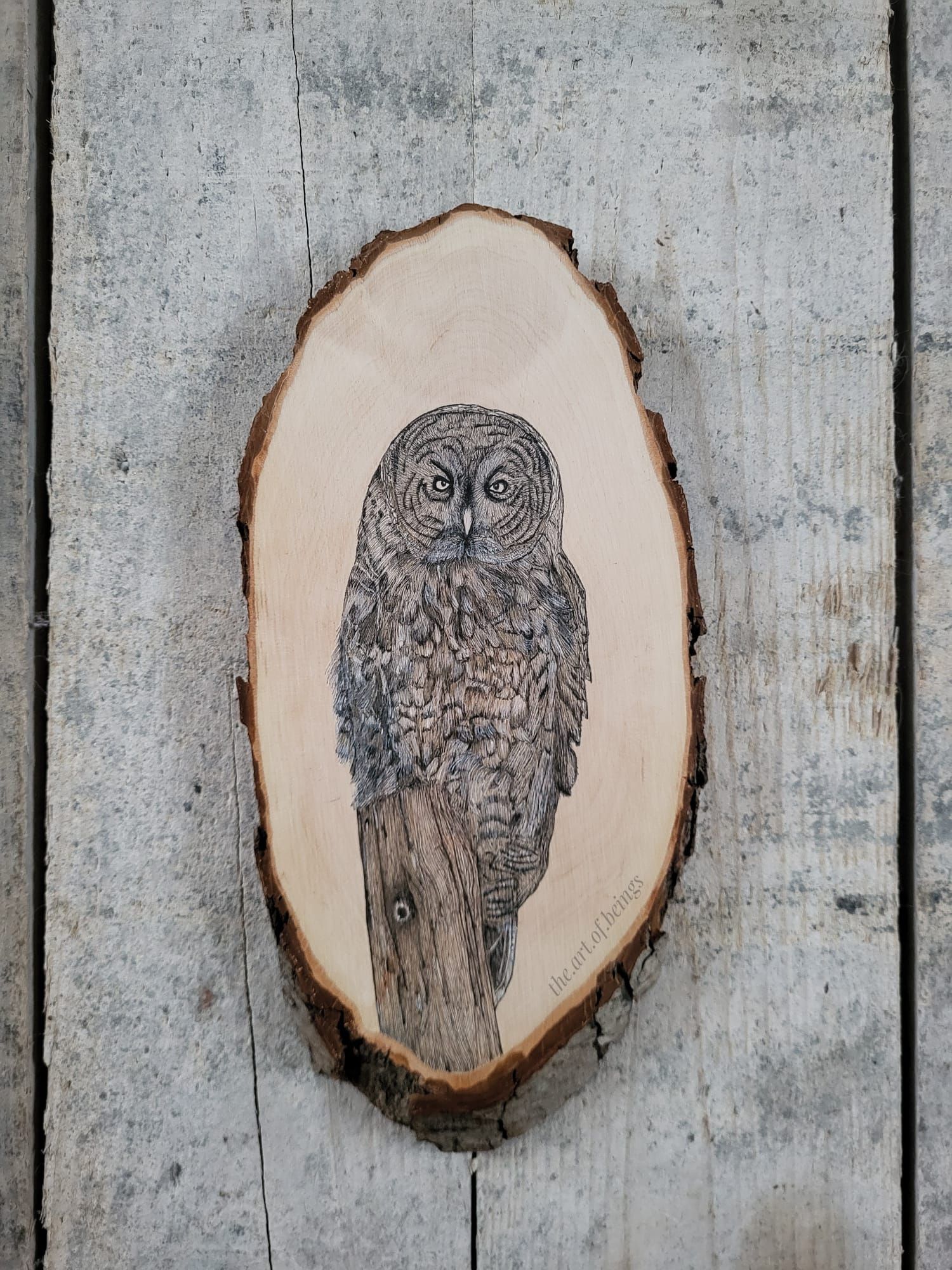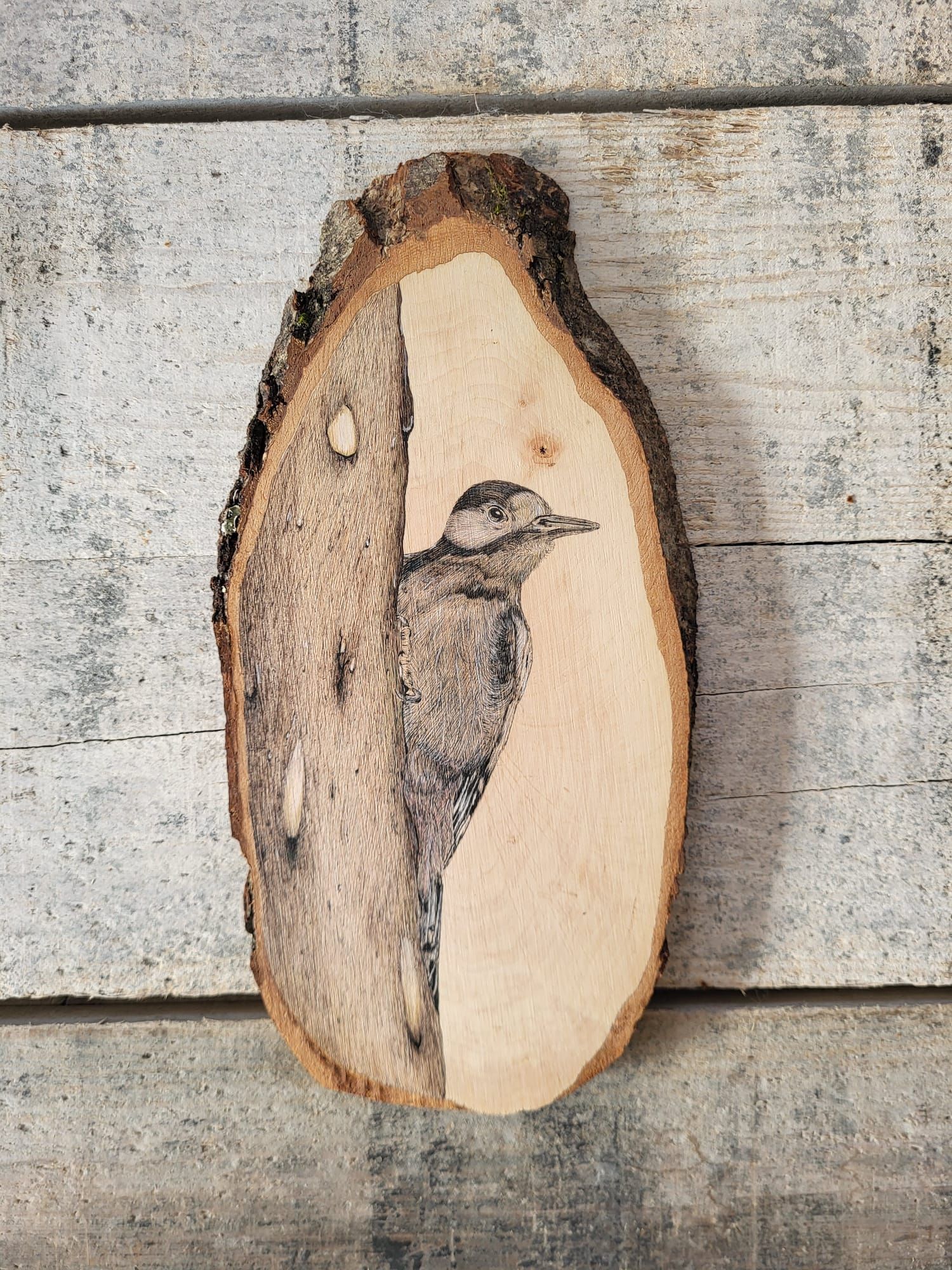 Great spotted woodpecker made with ink and a small addition of coloured pencil on wood.