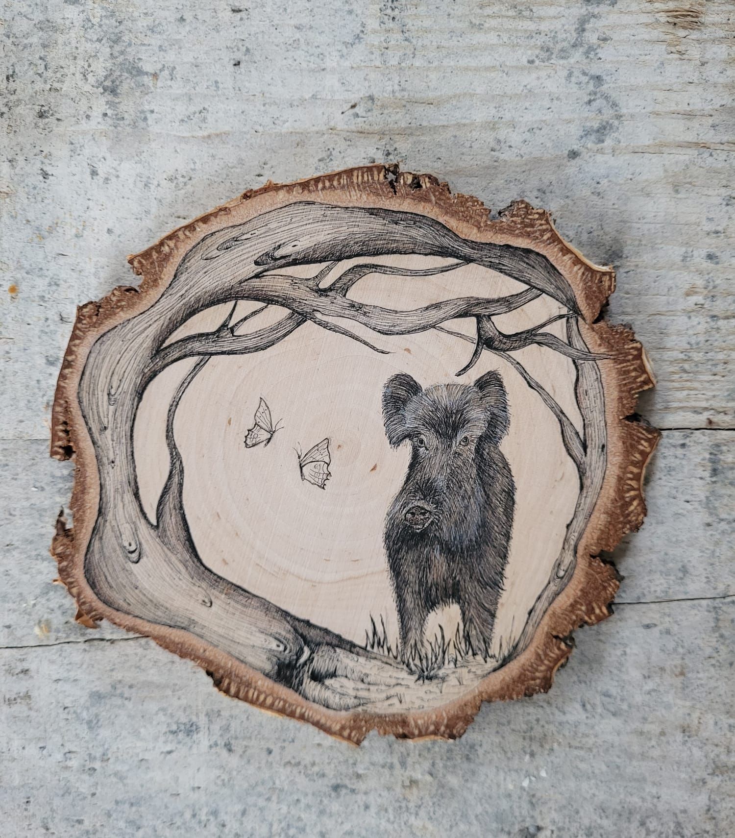Wild boar made with ink and a small addition of coloured pencil on wood.
